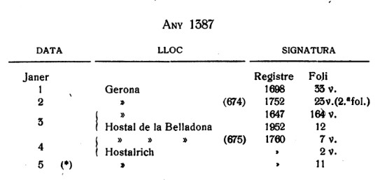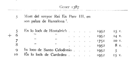 Page 97 of Daniel Girona i Llagostera’s Itinerary for Joan during his reign as king. Source: Daniel Girona i Llagostera, ‘Itinerari Del Rei En Joan I, 1387-1388.’ Estudis Universitaris Catalans. 13 (1928): 93–134.