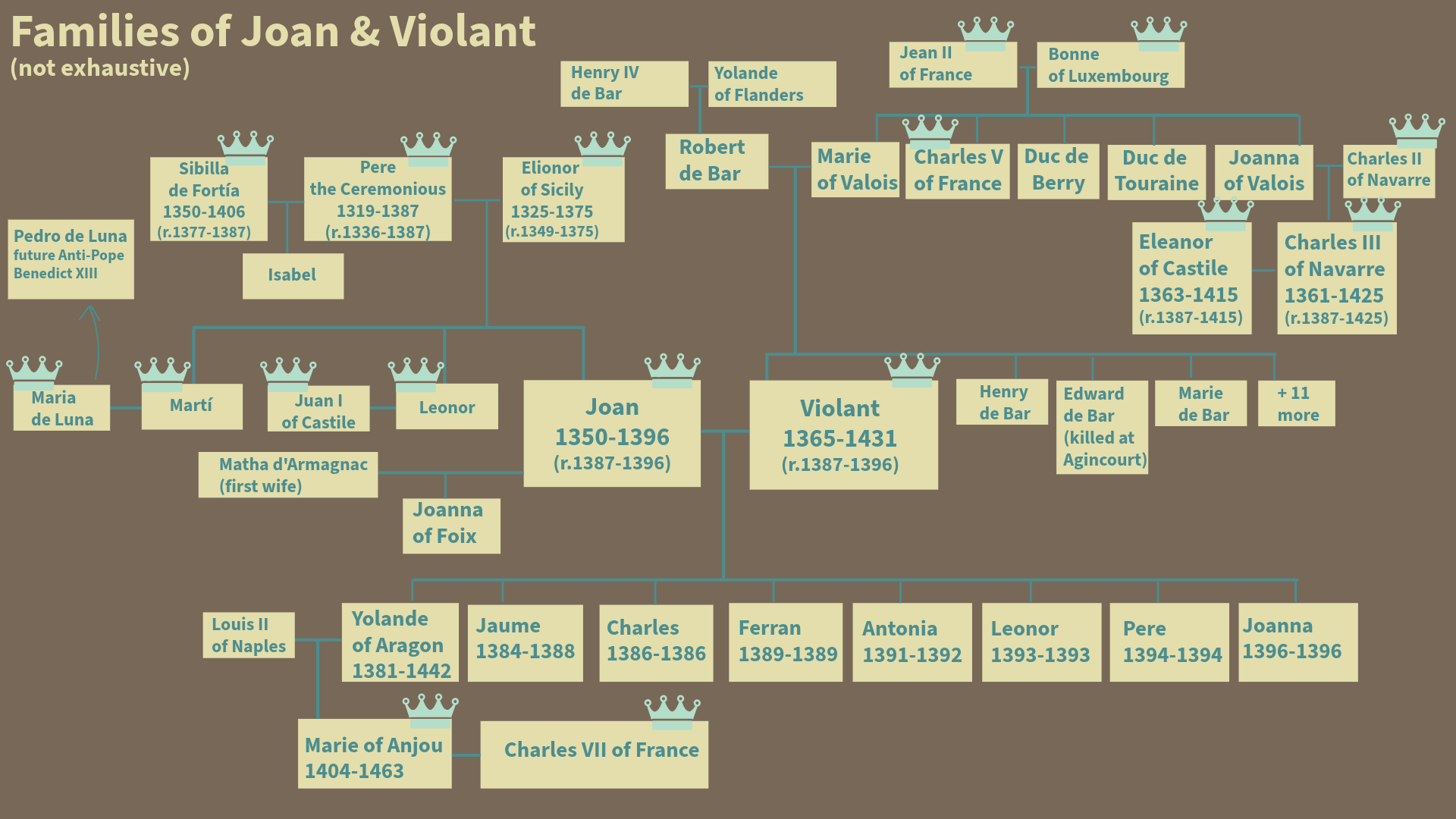 Contextualization: other monarchs of the Crown of Aragon had not used the French term ‘dauphin’ either before or since in the centuries surrounding Joan and Violant’s reign; wealthy patrons such as the Duc de Berry, Violant’s uncle, did much to finance the cultural production that made French music, literature, and fashion, the envy of its neighbors in the late fourteenth century