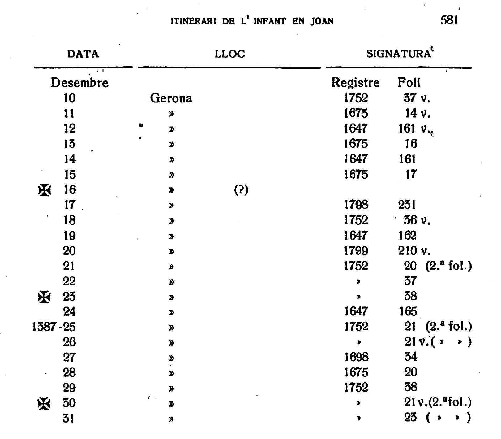 Page 581 of Daniel Girona i Llagostera’s Itinerary for Joan during his years as Primogenit. The crosses indicate that a particular day was a Sunday. Source: Daniel Girona i Llagostera, “Itinerari de l’Infant En Joan, Fill Del Rei En Pere III. 1350-1387.”
